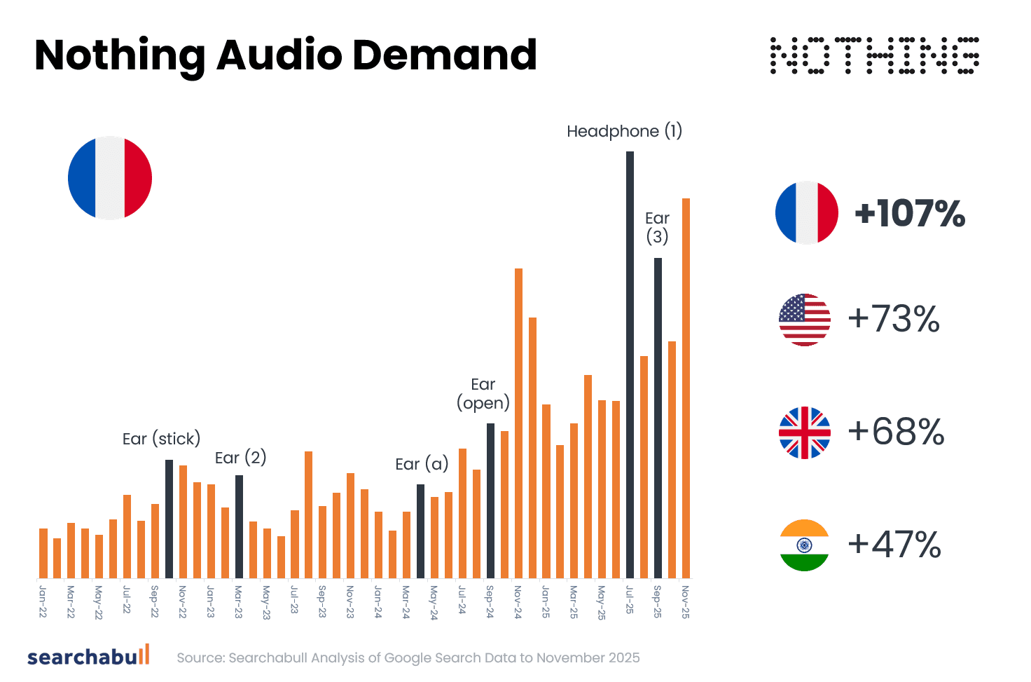 France has emerged as the clear breakout market, with Nothing audio searches up +107% year-on-year. This is not a marginal uplift – it represents a step-change in demand that puts France well ahead of other major markets.